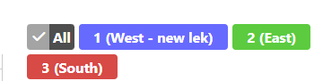 Sharp-tails are NOT using the north lek this year; the new viewing blind location is identified as the west (blue). The east (green) and south (red) leks will be used for viewing as in the past. The north lek had only about 5 dancing males for the last couple years as they have been expanding and moving to other leks. This year there are a few birds hanging out near the lek, but none are coming to the lek to dance.