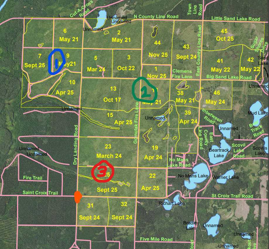 Do not use Google Maps except to get to Dry Landing Road & St. Croix Trail Road, 46.113886, -92.091977. Interior trails are mistaken for roads and incorrectly identified on Google Maps and OnX. If a drivable surface is identified as a Road, you may drive on it. If unnamed or identified as a Fire Lane (Gomulak, Clemens and Delong/Lien), public visitor vehicles are not allowed. The exception is the small segment of Gomulak needed from St Croix trail to get the cabin site that has the bathrooms and picnic area.